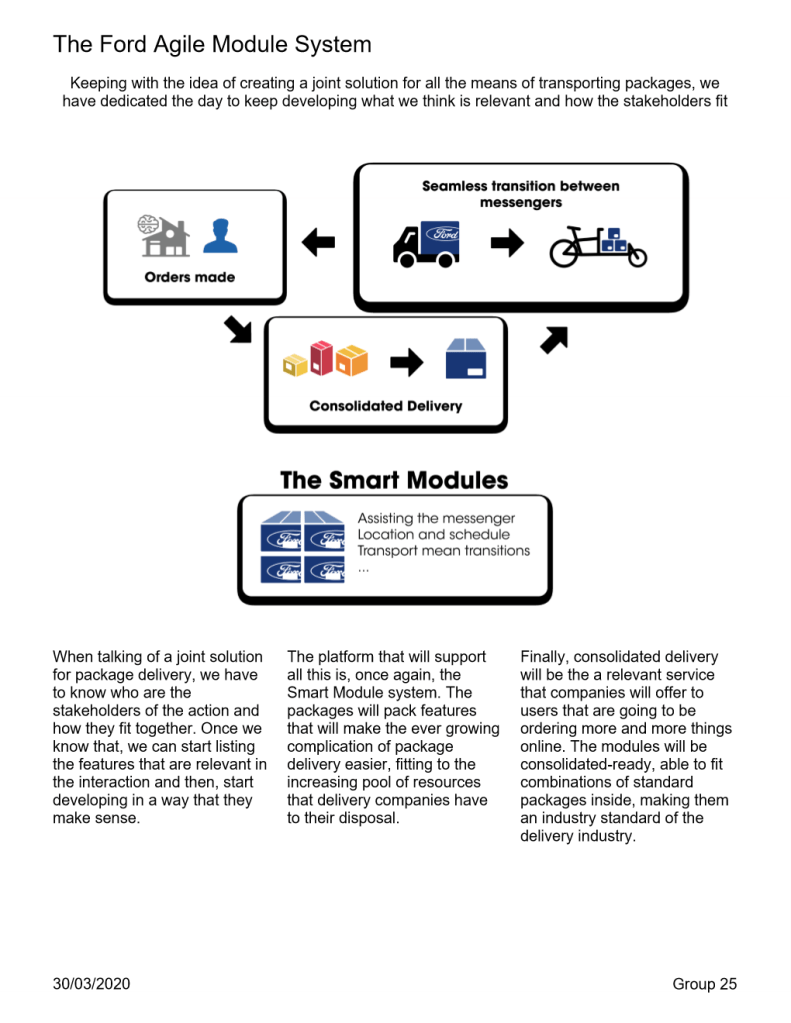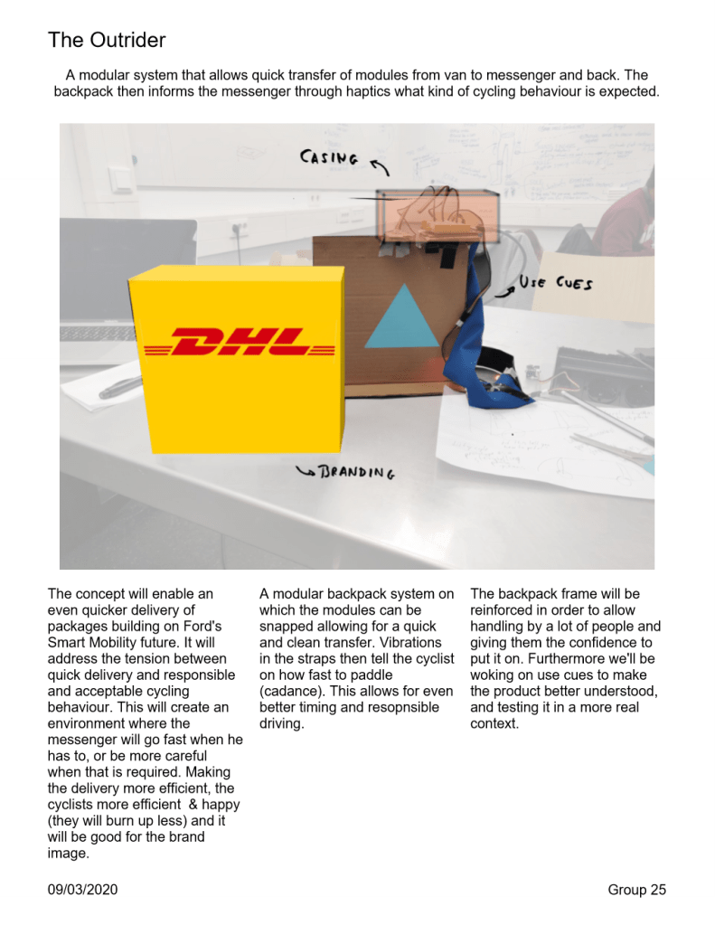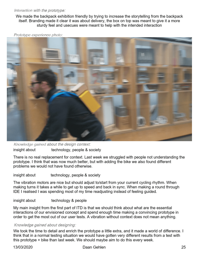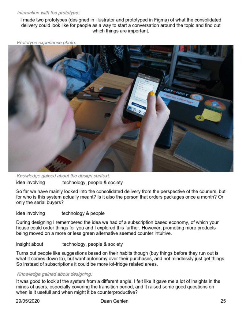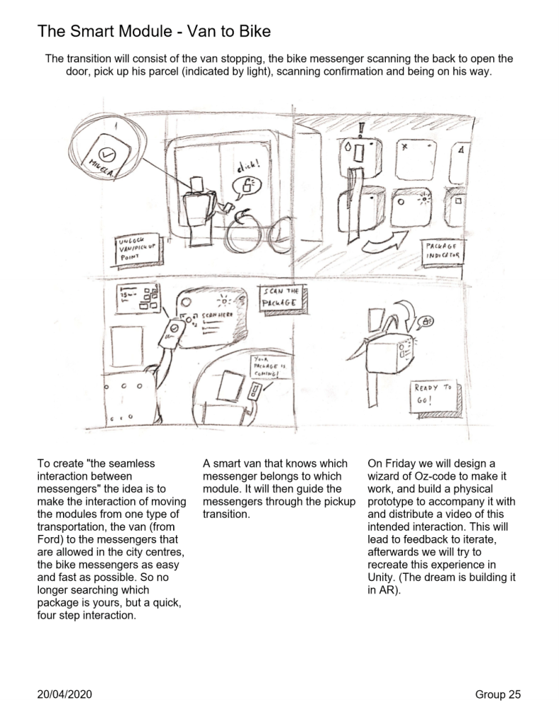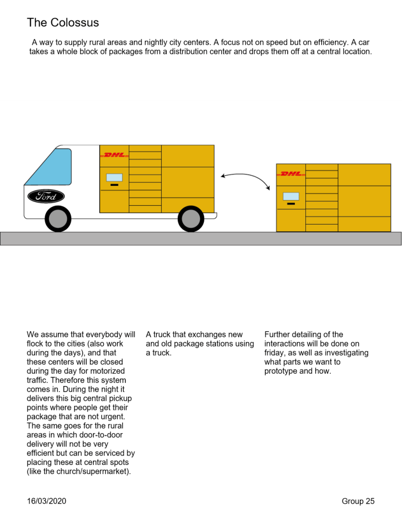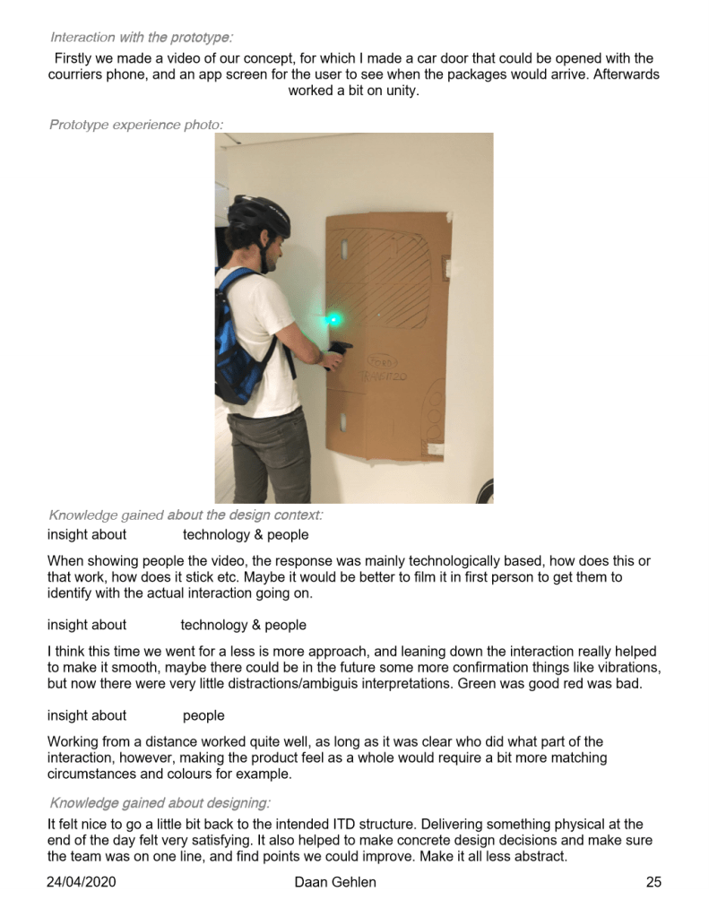Through a weekly iterative process we had to come up with an interactive prototype that would make the van more of a companion to the couriers. One afternoon we would conceptualise, while another day we would prototype (part of) the concept, test it, and take those lessons into next week’s conceptualisation session. In the end we came up with a redesign for the entire delivery system using consolidated delivery. To see the final design you can press the button below. To see the iterations from week to week scroll through the galleries.