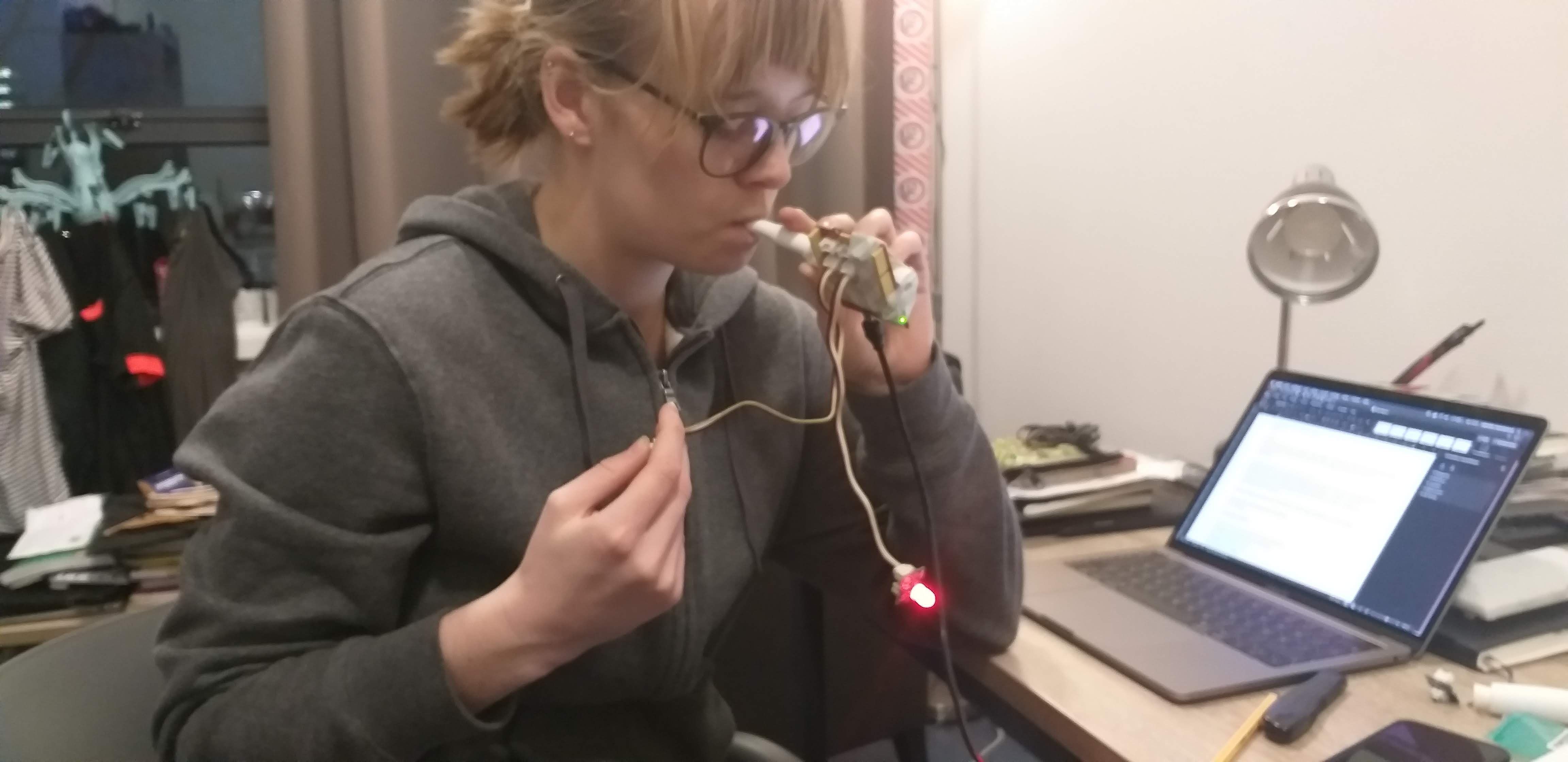 How: A device that heats up when you blow into it, thereby giving the user something to do, somewhere to leave his hands. It helps them to have a more open body language, warm hands and a purpose while being outside. This to eliminating a feeling of intrusion or being judgemental. Furthermore it gives the user a specific timeframe for the conversation. Blowing into a straw also generates a sense of calm and relaxation, as smoking does. It is a good distraction to fill potentially awkward silences with. The light gives a sense of feedback and instant gratification.