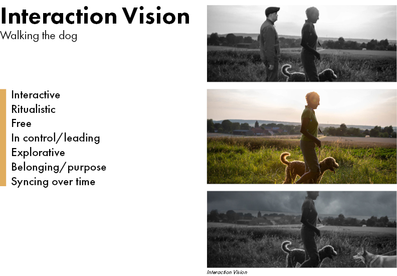 A Interaction Vision was created which was a situation in a completely different domain, but which had all the interaction qualities that were desired in the solution. For this project this was walking the dog, because you know more or less what is going to happen but never exactly, you might be surprised. Furthermore there is an interesting dynamic between you and the dog, pushing and pulling each other when being outside.