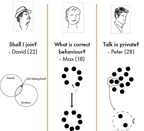 The assignment was to pick a very specific context and observe what was happening there. We had to see what was happening and come up with a design intervention that would fit that specific context and make it better. After some exploration I zoomed in on smoking area outside clubs and parties. As a non-smoker, this was completely unknown territory to me.