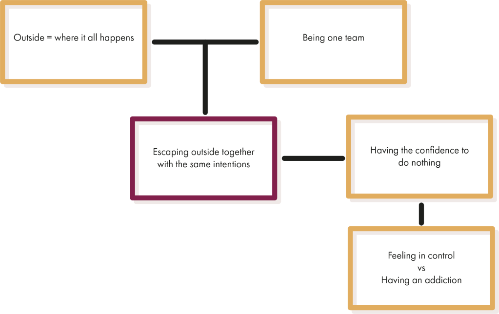 Next to having a Design Goal, the qualitative research also led to a lot of insights, that were clustered in the image below. The area where I believed I could add the most value was through looking at how people escape the party with the same intentions. Underlying this cluster was the insight that smokers only ask other smokers to go with them outside, because they know they are going to do the same thing, so it will