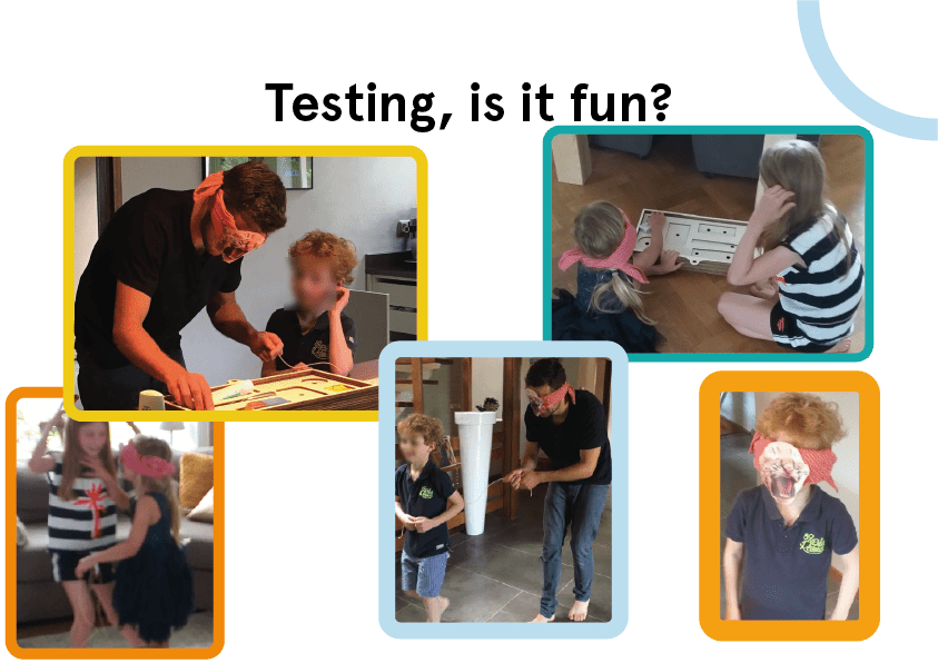 In order to reach this effect and get to this desired future I tested 6 possible games with a child of the target age, and tried to figure out which concept worked best, and also why that worked best, so that I could improve it even more. Furthermore, guiding really reminded my of a friend being a guide for a paratriathlete, who told me that guiding someone was “all about trust”. From here I found a concept that worked with the child setting up a track to be done, and then guiding the parent through it. This idea was tested and refined on multiple times to come up with the final design.