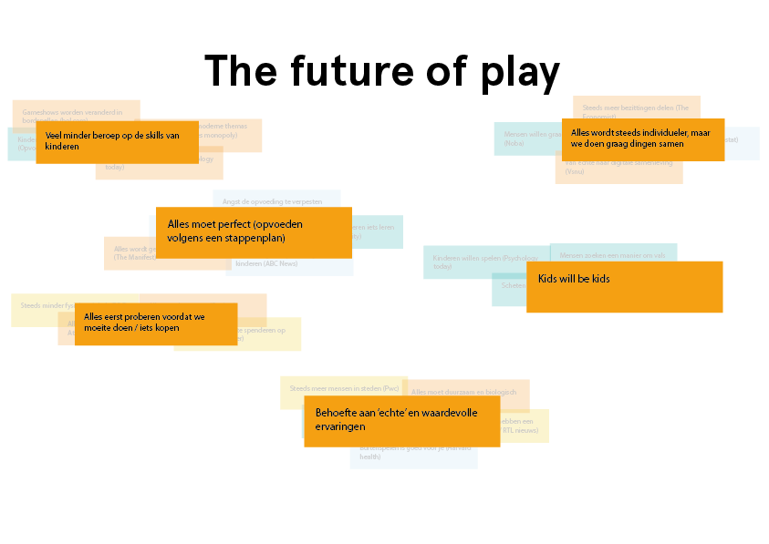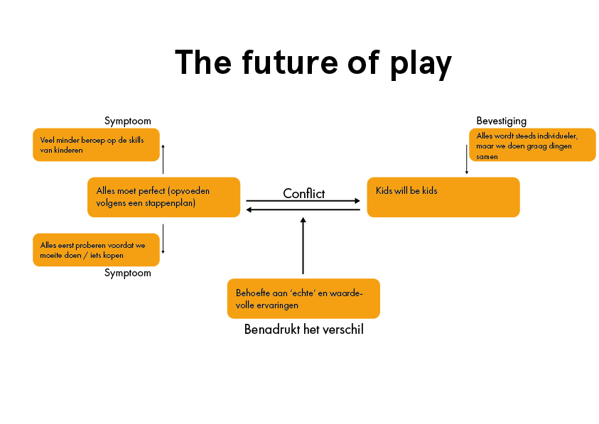 When getting the design brief, I felt that creating just another boardgame would be fun, but that I could add more value to the client’s business portfolio. Therefore I decided to use the Vision in Product Design (ViP) method. In this method you forecast an expected future, which you are going to try and turn into a desirable one using a design intervention. In the near future I am seeing a conflict arising between parents and their children. On the one hand parents are striving for a perfect upbringing, but kids will be kids, rejecting a perfect mold. At the same time parents are more and more looking for meaningful and ‘real’ experiences, only further emphasising this conflict.