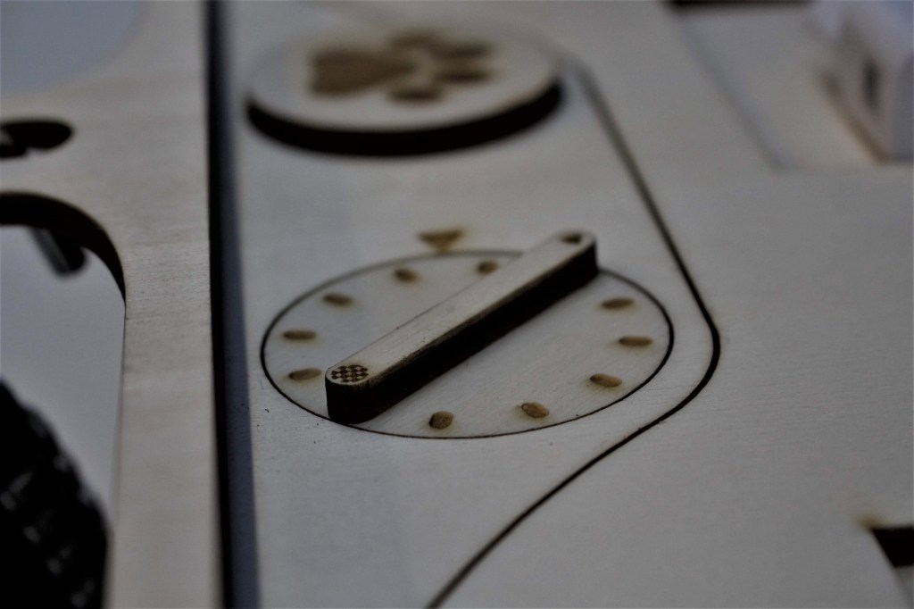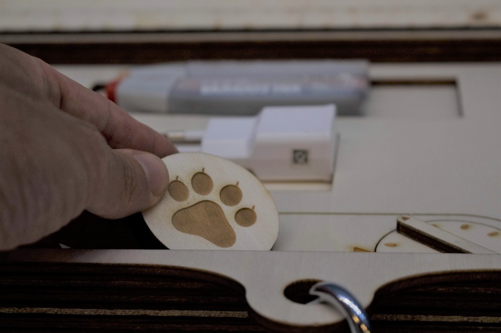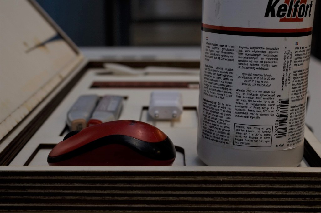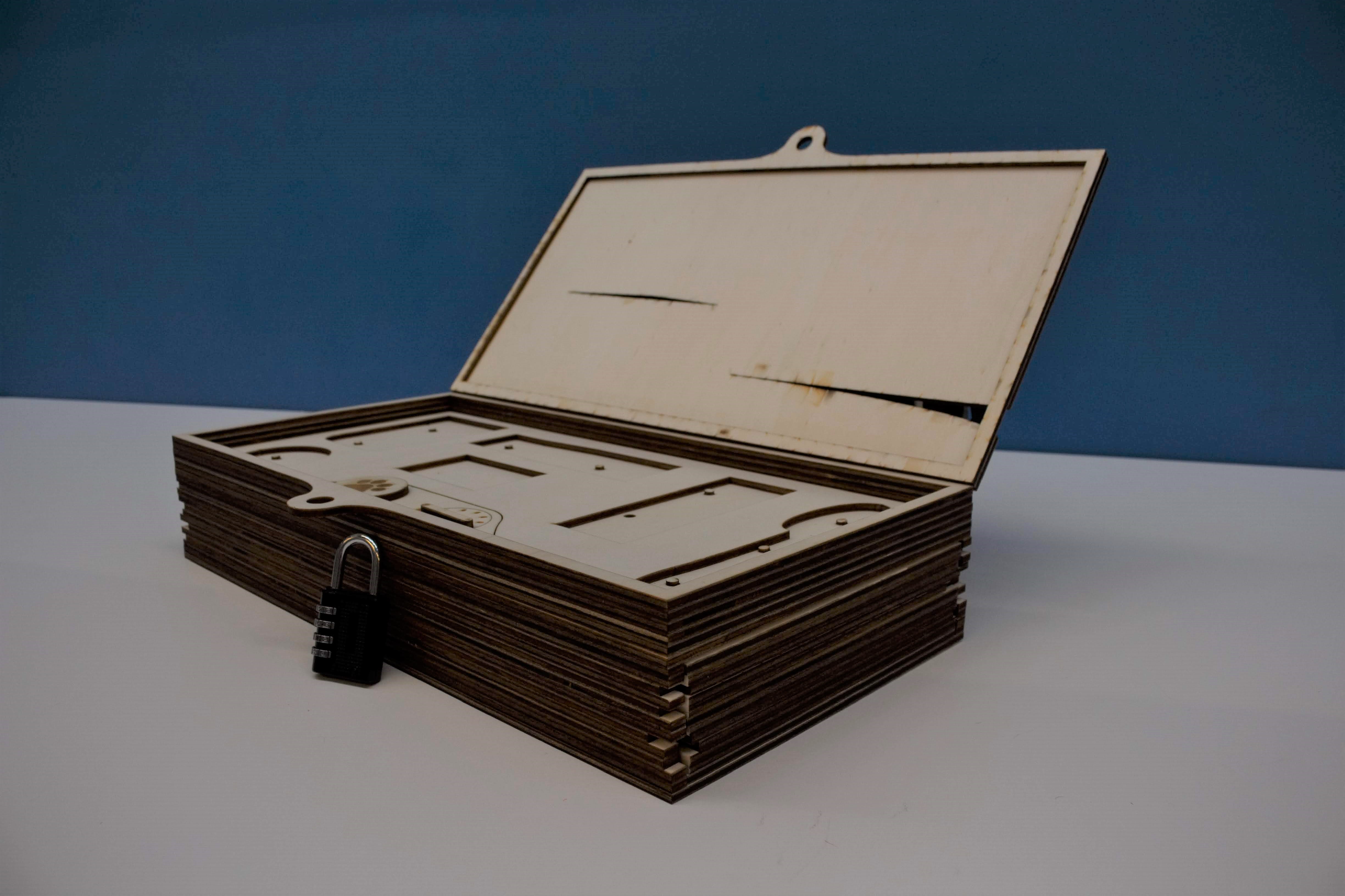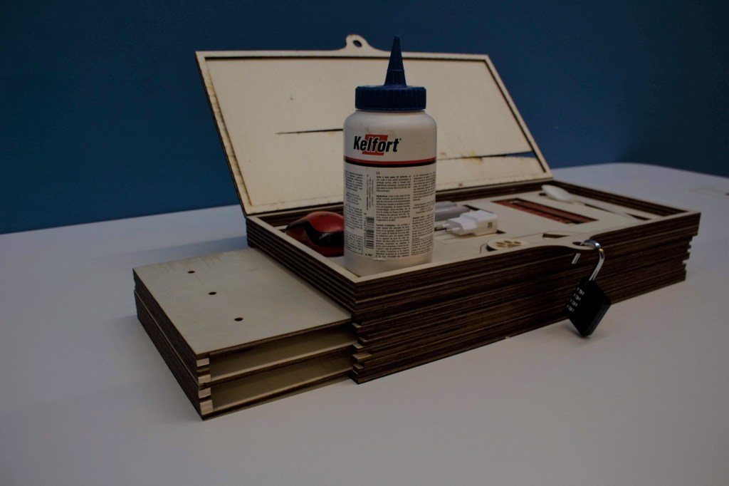 Firstly the lid needs to be taken off by opening a huge padlock, of which the code was on top of the box, since the children deemed storytelling from start to finish to be very important. Once opened the lid shows instructions and a grid for the children to put items in. Inside the shapes small pins are sticking out, locking the secret compartment for now. On top of these pins household items should be placed, instead of new ones, since I did not want to add anything unneessary from a sustainability point of view. This grid would be also be interchangeable, in order to be able to reuse the box often with new items. Furthermore, as it was important to have an online presence, the grid would be very instagram-friendly with its own hashtag.